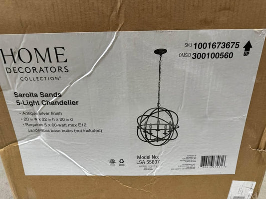 Home Decorators Collection Sarolta Sands 5-Light Antique Silver Leaf Chandelier Light Fixture with Caged Globe Metal Shade