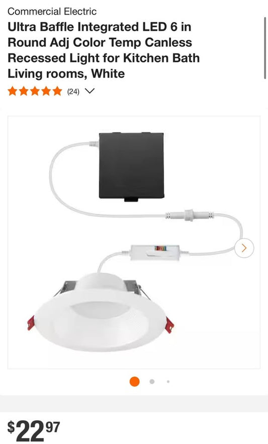 Commercial Electric Ultra Baffle Integrated LED 6 in Round Adj Color Temp Canless Recessed Light for Kitchen Bath Living rooms, White