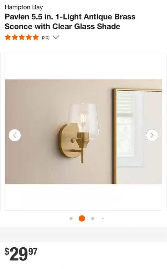 Hampton Bay Pavlen 5.5 in. 1-Light Antique Brass Sconce with Clear Glass Shade