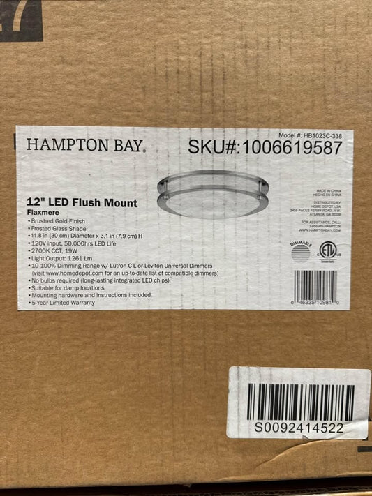 Hampton Bay Flaxmere 12 in. Brushed Gold Dimmable Integrated LED Flush Mount Ceiling Light with Frosted White Glass Shade
