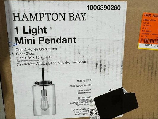 Hampton Bay Mullins 6.75 in. 1-Light Coal and Honey Gold Mini Pendant Hanging Light, Kitchen Pendant Lighting with Clear Glass Shade