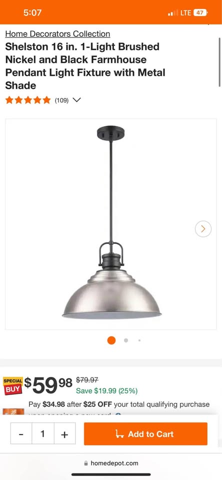 Home Decorators Shelston 16 in. 1-Light Brushed Nickel and Black Farmhouse Pendant Light Fixture with Metal Shade