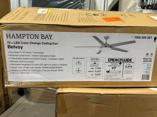 Hampton Bay Belvoy 70 in. Indoor Brushed Nickel DC Motor Ceiling Fan with Adjustable White Integrated LED with Remote Included
