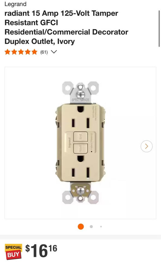 Legrand radiant 15 Amp 125-Volt Tamper Resistant GFCI Residential/Commercial Decorator Duplex Outlet, Ivory