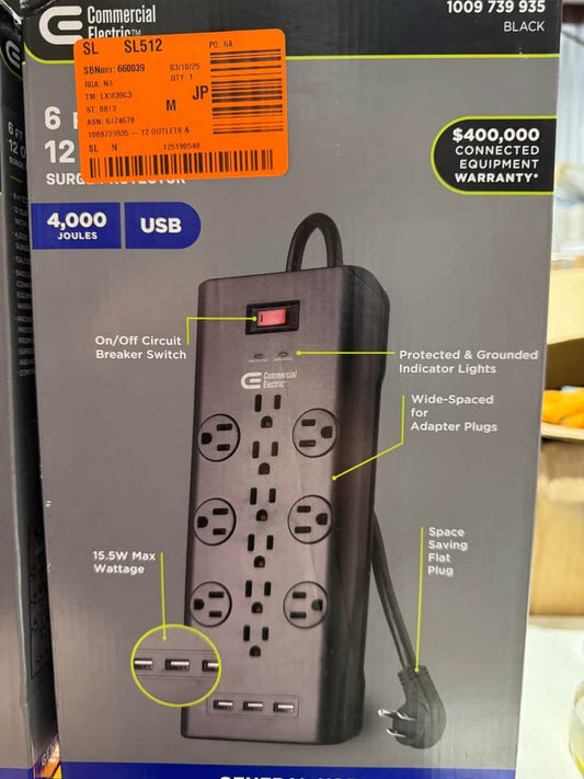 Commercial Electric 6 ft. 12-Outlet Black Surge Protector with USB