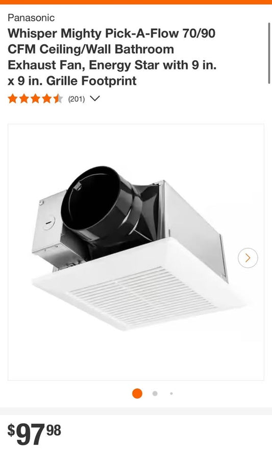 Panasonic Whisper Mighty Pick-A-Flow 70/90 CFM Ceiling/Wall Bathroom Exhaust Fan, Energy Star with 9 in. x 9 in. Grille Footprint