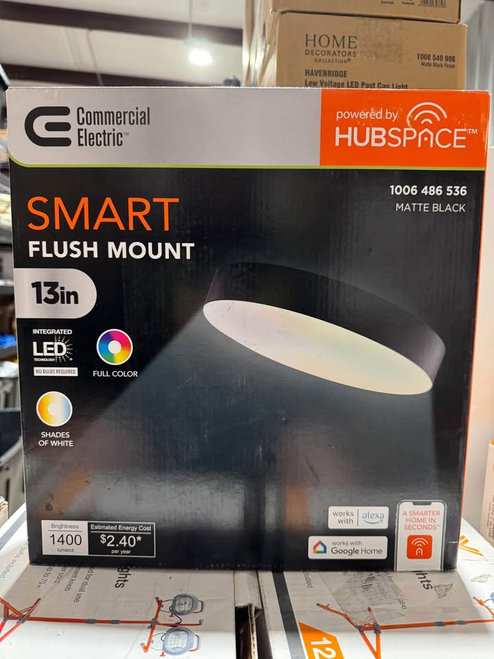 The 13 in. Lakeshore Smart Integrated LED Flush Mount from Commercial electric with a matte black finish is a great addition to any room. This light can be controlled through the Hubspace app (no hub required) on your smart devices or through Alexa and Google Assistant with voice controls. You have the freedom to select from endless amounts of color options as well as tunable white color options between 2700K-6500K. The light has a full brightness of 1400 Lumens and is also dimmable to your desired brightness level. Through the Hubspace app you can setup group control for multiple Hubspace compatible lights, as well as set schedules for pre-selected times for the lights to turn on and off. All hardware is included for easy installation and this light is supported by a 5-year warranty and is also ENERGY STAR rated.