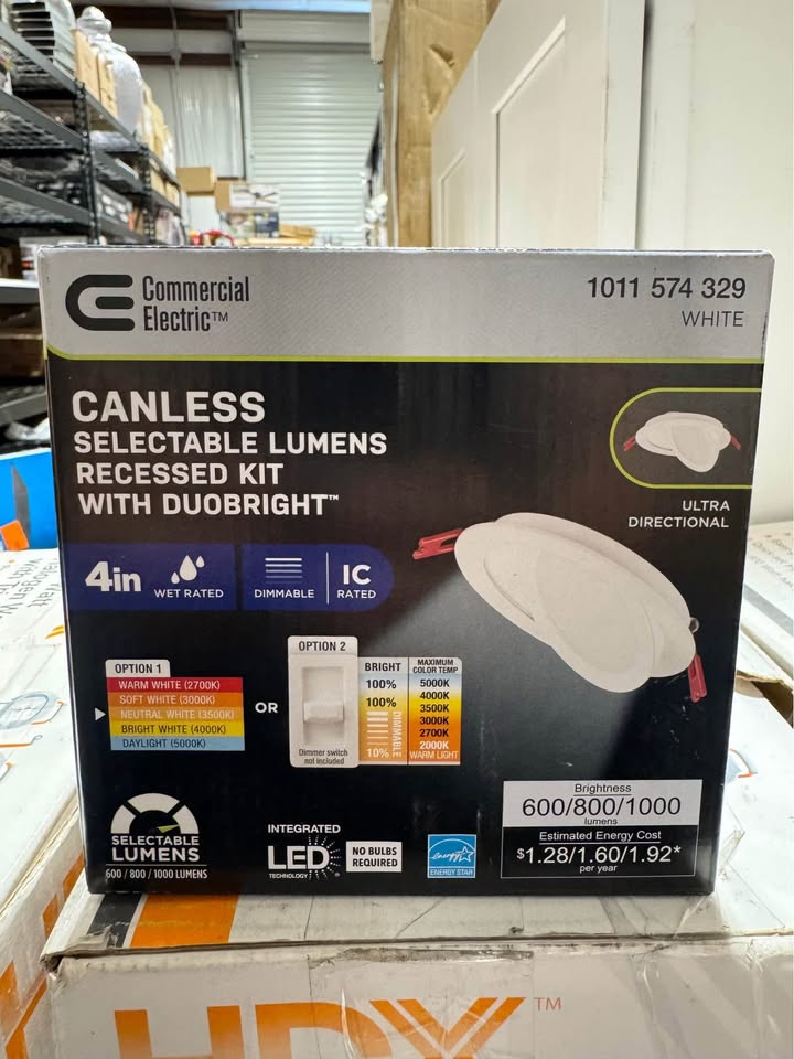 The Commercial Electric Ultra Directional Recessed Lighting Kits are designed specifically to direct light where it is needed. These lights can be angled to 90 degrees making it ideal for sloped ceilings, wall washing or highlighting specific areas. The integrated color changing switch is located on the cable so you can choose between a 2700, 3000, 3500, 4000 or 5000 Kelvin temperature to best suit your needs. 2700 or 3000 Kelvin is perfect for relaxing, 3500 or 4000 Kelvin is the ideal choice for everyday affairs and 5000 Kelvin is great for task lighting in a basement, hallway or work area. Insulation Contact rated for direct contact with insulation, these lights won't overheat, do not require a bulky can and will last for years to come - 50 000-hours or approximately 45-years if used for 4-hours per day to be exact. Wet rated and certified airtight, this 3 in. kit is perfect for your bathroom, drop ceilings, outdoor soffits and all general lighting applications.