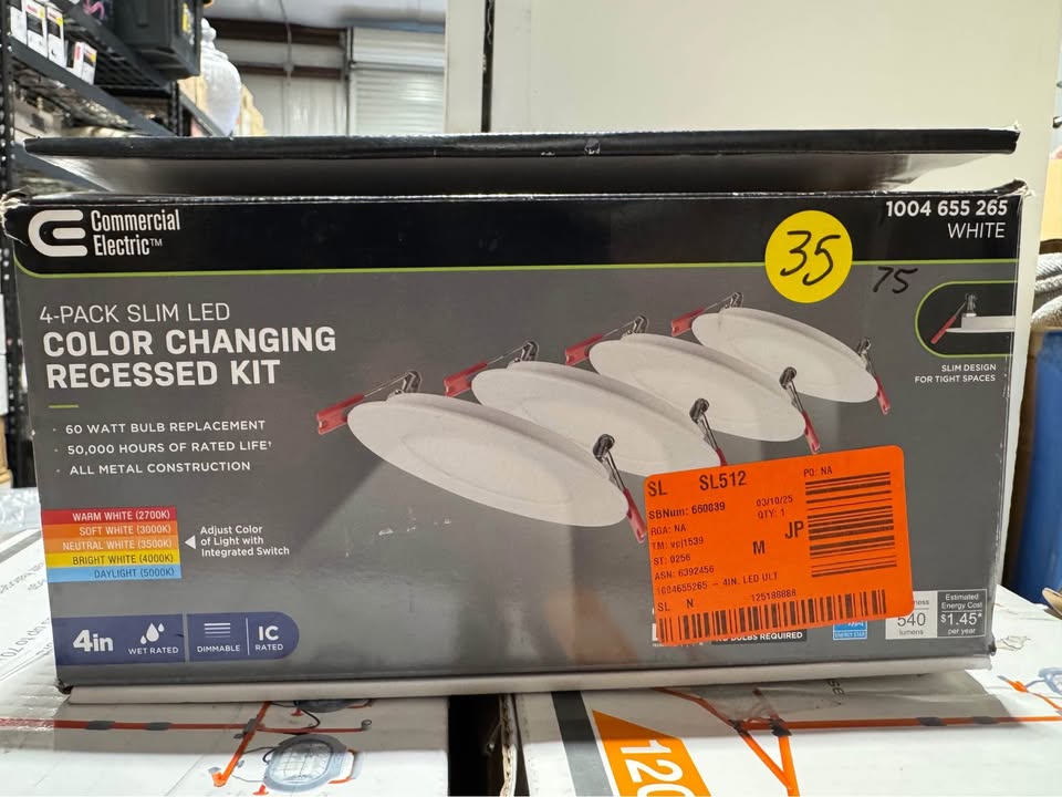The Color Temperature Select Recessed Lighting Kits are the recessed lights of the future. Not only is each fixture is designed specifically for small spaces where height clearance is limited such as beams or ductwork, you can change the color temperature with a flick of a button. The integrated color changing switch is located on the cable so you can choose between a 2700, 3000, 3500, 4000 or 5000 Kelvin temperature to best suit your needs. 2700 or 3000 Kelvin is perfect for relaxing, 3500 or 4000 Kelvin is the ideal choice for everyday affairs and 5000 Kelvin is great for task lighting in a basement, hallway or work area. Energy Star certified, and Insulation Contact rated for direct contact with insulation, these lights won't overheat, do not require a bulky can and will last for years to come - 50 000 hours or approximately 34 years if used for 4 hours per day to be exact. Wet rated and certified airtight, this 4 in. kit is perfect for your bathroom, drop ceilings, outdoor soffits and all general lighting applications.