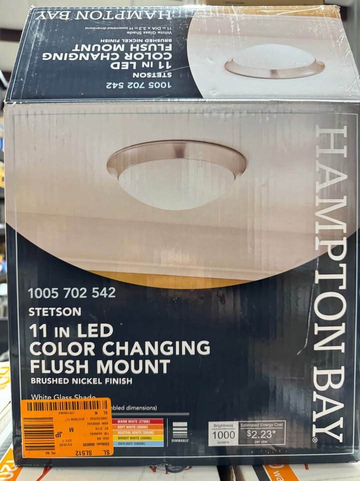 This Hampton Bay 11 in. LED, 5CCT selectable, Flush Mount is designed to give you the option between 2700K/3000/3500K/4000K/5000K all conveniently in 1 ceiling light. It features a Brushed Nickel finish and a sleek white glass shade. The integrated LED light source reduces energy consumption by 70%, and because there are no bulbs to replace, it saves you time and money while looking great in any room.